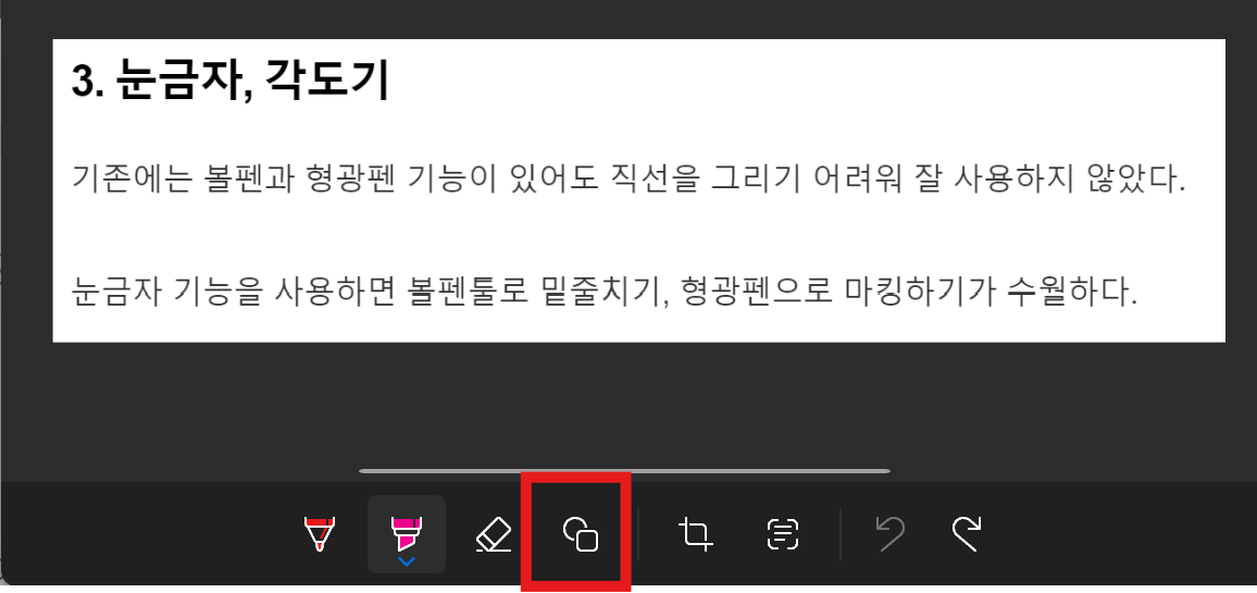 눈금자 기능을 사용하면 볼펜툴로 밑줄치기, 형광펜으로 마킹하기가 수월하다.