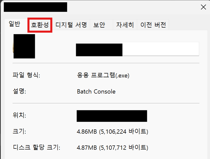 2. 속성 창에서 "호환성" 탭으로 이동한다.