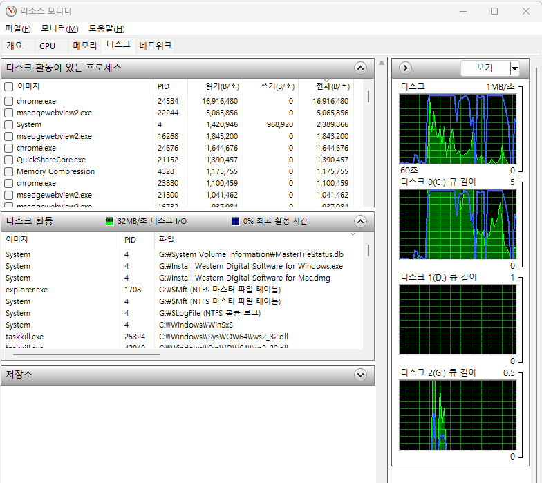 - "디스크" 탭 → "디스크 활동" 섹션에서 활동을 확인