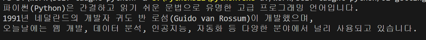 print("파이썬(Python)은 간결하고 읽기 쉬운 문법으로 유명한 고급 프로그래밍 언어입니다. \n1991년 네덜란드의 개발자 귀도 반 로섬(Guido van Rossum)이 개발했으며, \n오늘날에는 웹 개발, 데이터 분석, 인공지능, 자동화 등 다양한 분야에서 널리 사용되고 있습니다.")